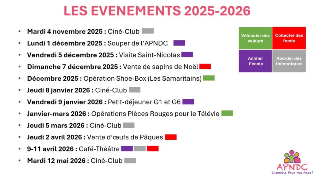 Pour vous tenir au courant des événements que nous organisons au cours de l’année scolaire, nous vous invitons à consulter notre agenda :