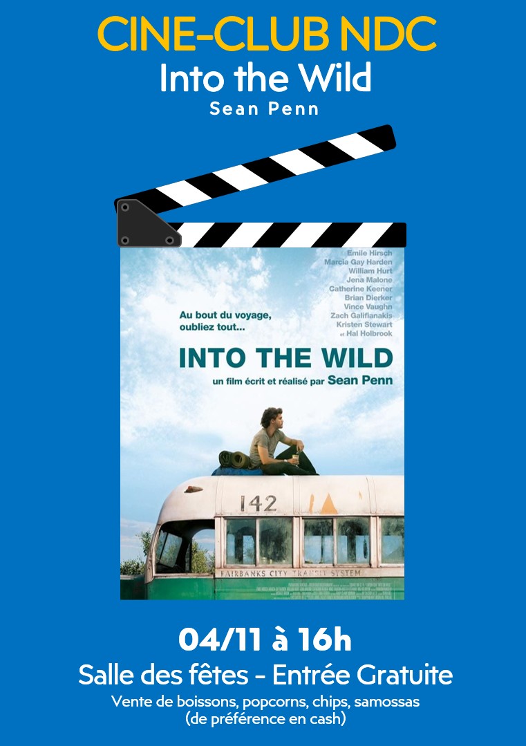 Rejoignez-nous le 4 novembre 2025 à 16h00 dans la salle des fêtes pour la projection du film Into the Wild, réalisé par Sean Penn et inspiré d’un fait divers.