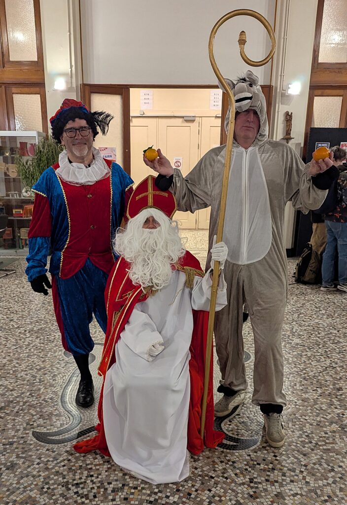Il était accompagné des fidèles compagnons le Père Fouettard (plein de suie) et l’âne.